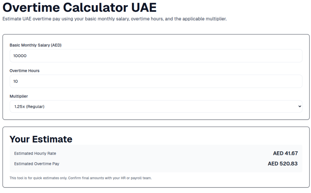 Calculating overtime pay in the UAE can be confusing, especially when different multipliers apply depending on the type of workday. A UAE Overtime Calculator helps you quickly estimate how much overtime pay you may be entitled to based on your basic monthly salary, overtime hours, and the applicable multiplier.
